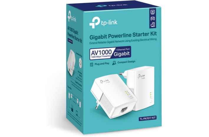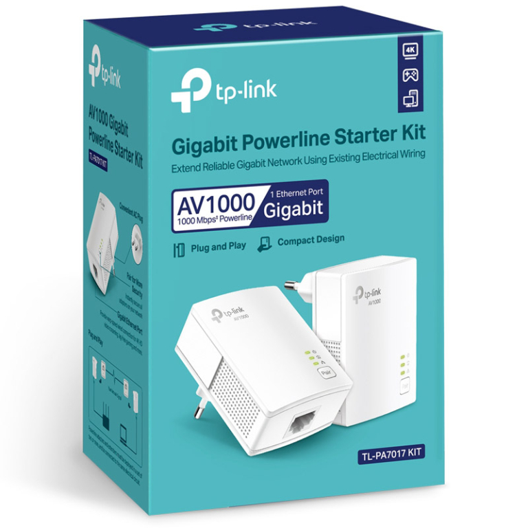 TP-LINK TL-PA7017 KIT AV1000 gigabit powerline starter kit adapter vam omogoča hitrost prenosa podatkov do 1000 Mbps in zagotavlja varna ožičena omrežja za namizja, pametne televizorje ali igralne konzole. Nastavite omrežje za napajanje v nekaj minutah in uživajte v hitrih, žičnih in brezžičnih povezavah.