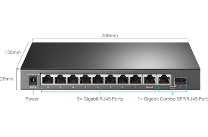 Vmesniki:9x gigabit RJ45, 1x combo gigabit SFP/RJ45