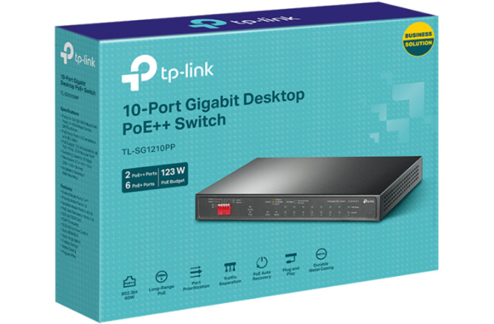 TP-LINK TL-SG1210PP 10-port Gigabit 6xPoE+/2xPoE++ 123W mrežno stikalo-switch je idealno za hitro prenašanje podatkov in napajanje preko enega kabla. Z vgrajenimi PoE+ in PoE++ vrati omogoča stabilno delovanje naprav in preprosto namestitev brez konfiguracije.