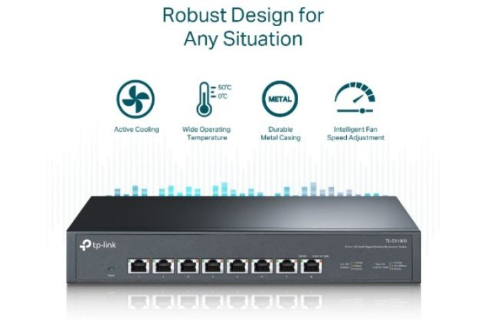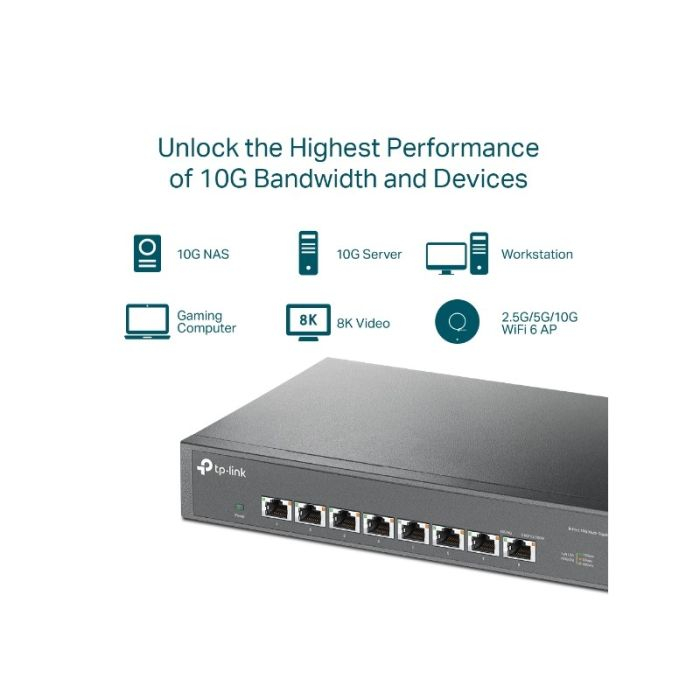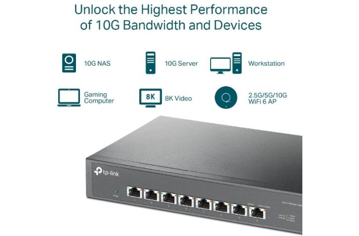 Osem 10 Gbps vrat. 8 × 10-Gigabitnih vrat odklene najvišjo zmogljivost vaše 10G/Multi-Gig pasovne širine in naprav ter zagotavlja do 160 Gbps preklopne zmogljivosti.