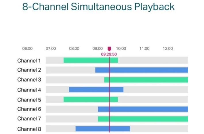 8-kanalno hkratno predvajanje*: ponovno predvajajte vir iz do 8 kamer hkrati, povečajte hitrost ponovnega predvajanja in poiščite dogodke v video razporedu za preprost pregled posnetkov.
