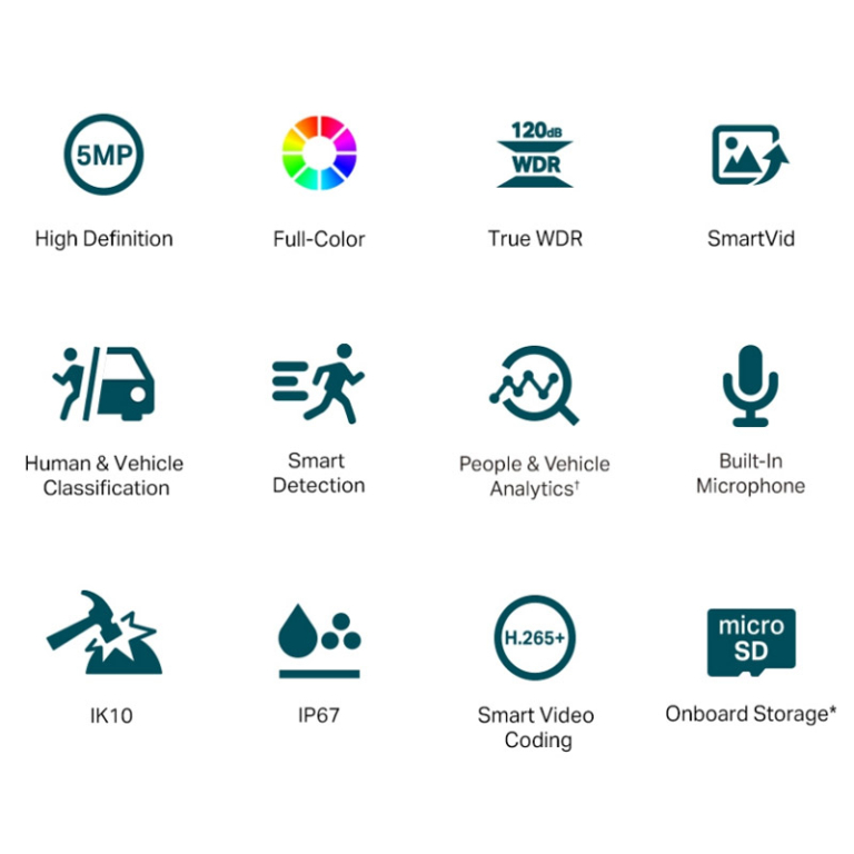 TP-LINK Vigi C250 5MP (2.8mm) IR FullHD IP65 360° zunanja nadzorna kamera je vrhunska izbira za nadzor vašega okolja. S 5 milijoni slikovnih pik in 24-urno barvno funkcijo omogoča izjemno natančen nadzor tudi v temnih okoljih. Pametno zaznavanje omogoča hitro odzivanje na dogodke, medtem ko IK10 odpornost proti vandalizmu in IP67 vodoodpornost zagotavljata trpežnost in zanesljivost.