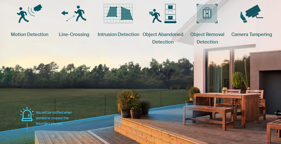 - Pametno zaznavanje: Prejmite obvestila in preverite vire, ko nekdo prečka mejo, vstopi na območje, ki ste ga nastavili, ovira kamero ali odstrani/zapusti predmete.
