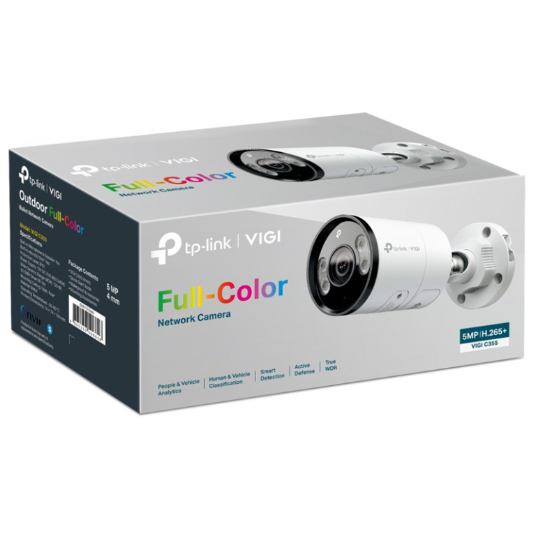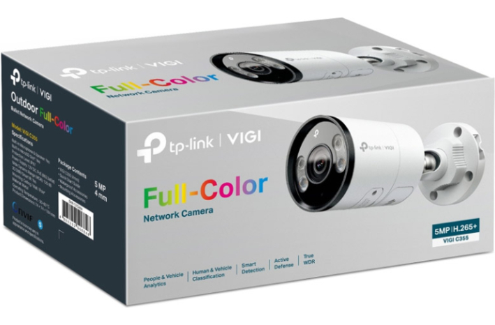 TP-LINK VIGI C355 4mm Full-Color IR zunanja nadzorna kamera ponuja 5MP supervisoko ločljivost in 24-urno polno barvo. Pametno zaznavanje, aktivna obramba, in vodoodporen IP67 zagotavljajo varnost. Tehnologija stiskanja H.265+ omogoča učinkovito shranjevanje posnetkov.