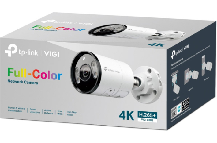 TP-LINK VIGI C385 2,8mm Full-Color IR dnevna/nočna 8MP LAN 4K zunanja nadzorna kamera zagotavlja izjemno jasne posnetke v 24-urnem barvnem snemanju. Pametna tehnologija zaznave in aktivna obramba poskrbita za varnost in natančnost.