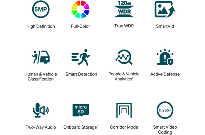 TP-LINK VIGI C450 2.8mm 5MP nadzorna kamera je opremljena s 5 MP super visoko ločljivostjo, ki omogoča jasne in barvite posnetke tudi v temi. S pametnim zaznavanjem in analitiko ljudi in vozil vam omogoča natančno spremljanje dogodkov.