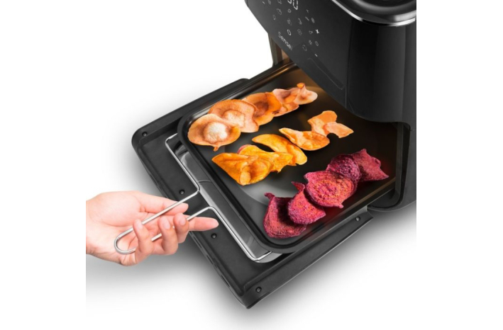 Vključuje tudi 6 dodatkov: 2 pekača, pladenj za zbiranje olja, klešče za ekstrakcijo, 2,9 L okroglo vrtljivo košaro in kavlje za pečenje.