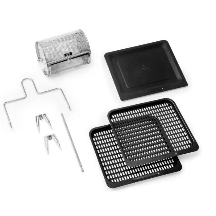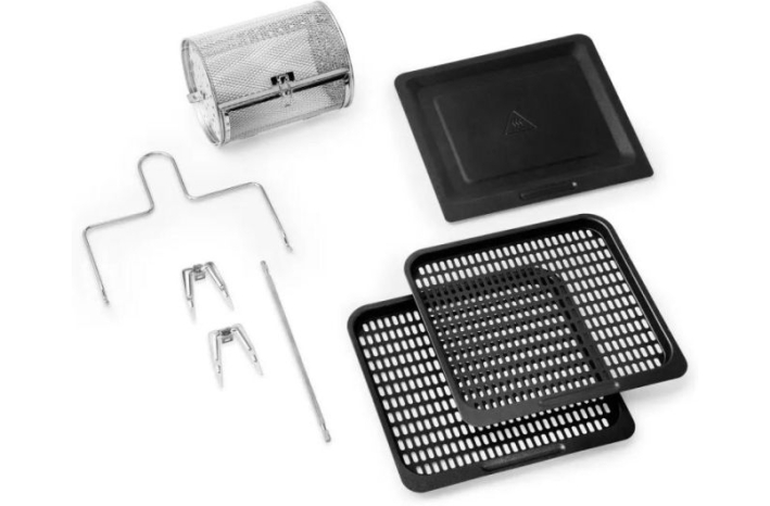 Vključenih je 6 dodatkov: 2 pladnja za peko, pladenj za zbiranje olja, izvlečne klešče, 2,9-litrska vrtljiva okrogla košara in kavlji za peko.