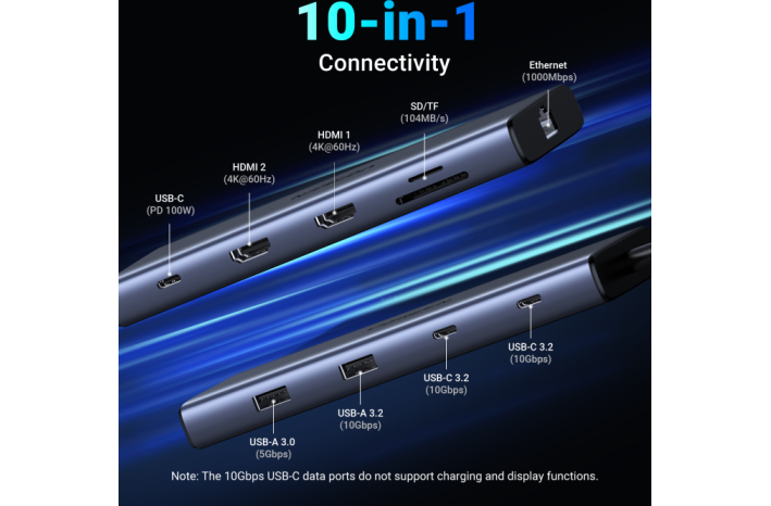 to vsestransko vozlišče ima skupno 10 vrat, vključno z 2x USB-C (10Gbps), 2x USB-A (1x 10Gbps, 1x 5Gbps), 2x HDMI (4K@60hz), 1x RJ45 in 1x SD 3.0/TF režo.