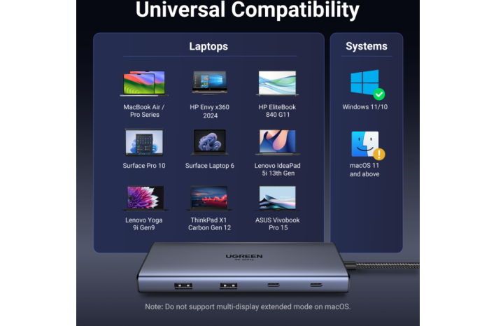 UGREEN 10-v-1 USB C Hub je združljiv s široko paleto naprav, vključno s prenosniki, tablicami in pametnimi telefoni. Brezhibno deluje s sistemoma Windows in Mac, zaradi česar je popoln dodatek k vsaki nastavitvi.