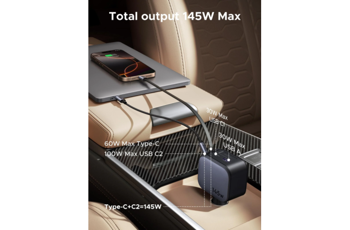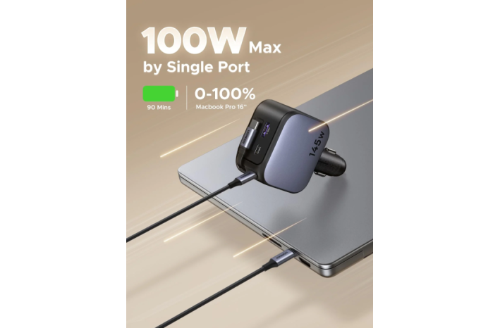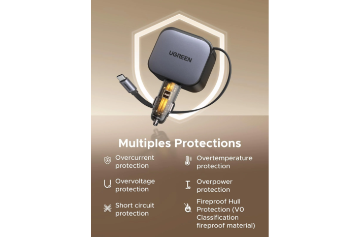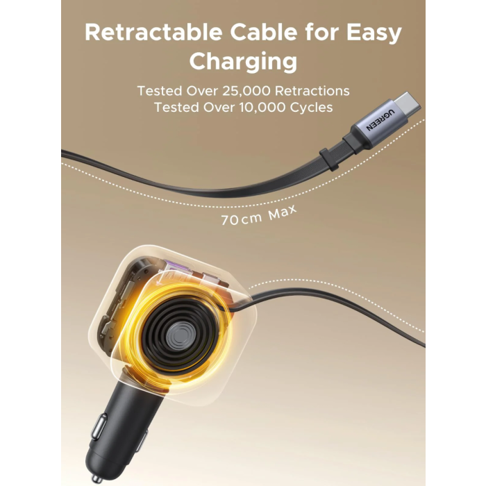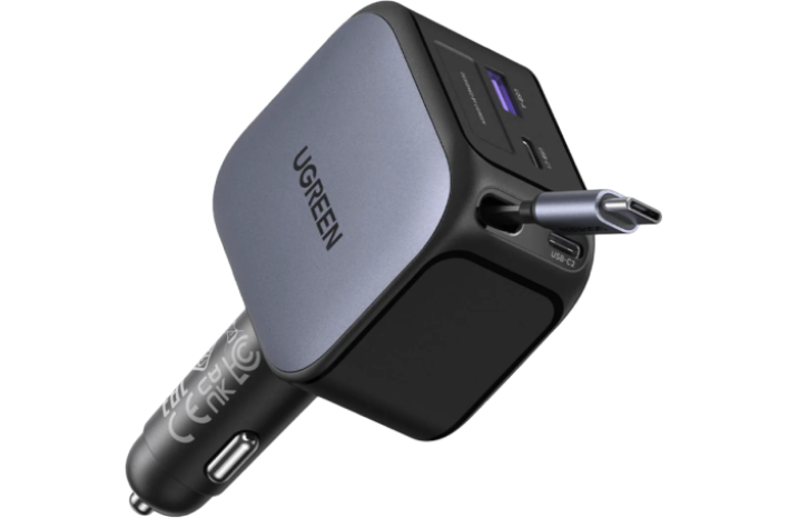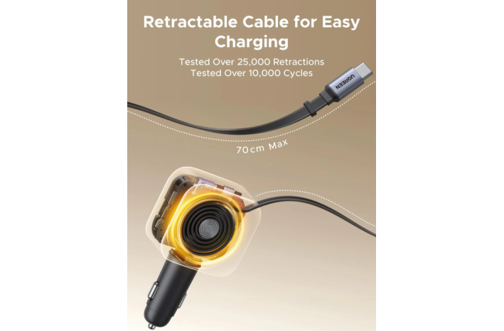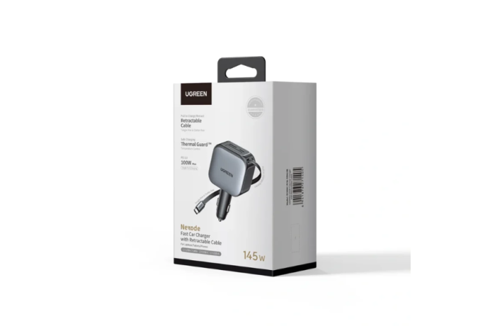 Ugreen 55910B prinaša popolno kombinacijo moči, elegance in praktičnosti za vsako vozilo. Zasnovan je za uporabnike, ki želijo polniti več naprav hkrati – od prenosnikov in tablic do pametnih telefonov. Vgrajeni izvlečni USB-C kabel se raztegne do 70 cm in se samodejno navije nazaj, kar ohranja notranjost avtomobila urejeno. Dodatni USB-C in USB-A priključek omogočata skupno moč do 145 W, kar zadostuje tudi za hitro polnjenje večjih naprav, kot so MacBook ali iPad. Polnilnik podpira širok nabor hitrih polnilnih protokolov (PD 3.0, PPS, QC 3.0, SCP, FCP, AFC), kar zagotavlja univerzalno združljivost z najnovejšimi napravami. Kompaktno aluminijasto ohišje in napredne zaščite proti prenapetosti, pregrevanju in kratkemu stiku pa skrbijo za varno in zanesljivo uporabo v vsakem vozilu.