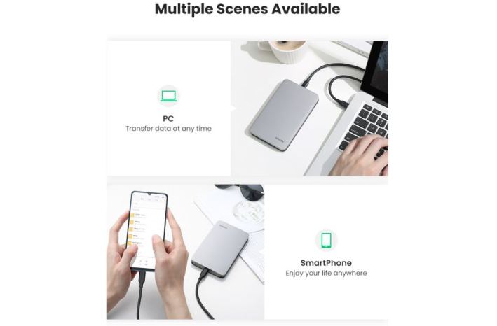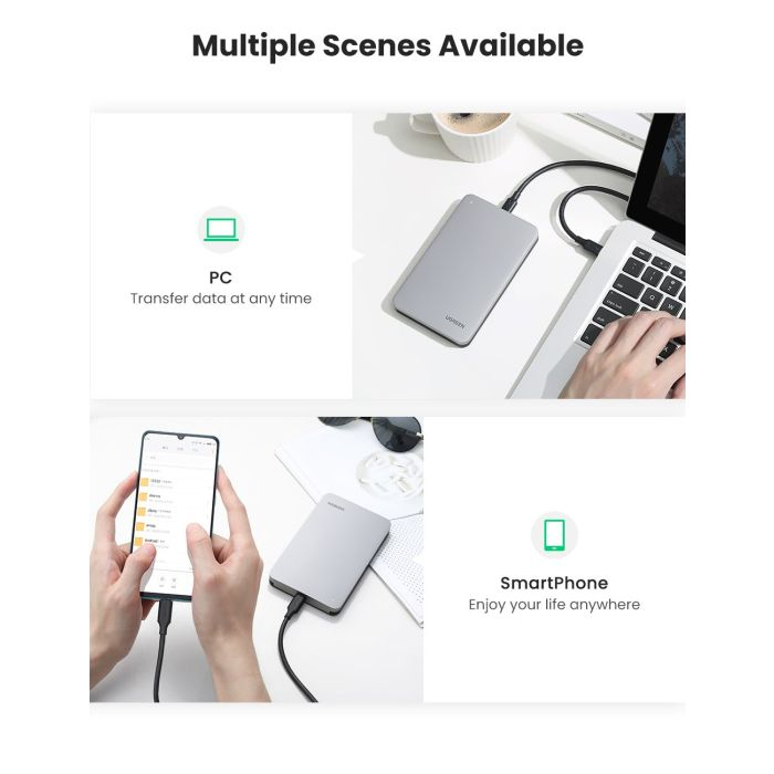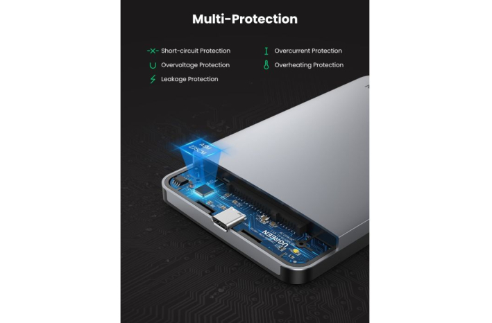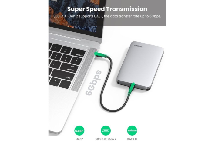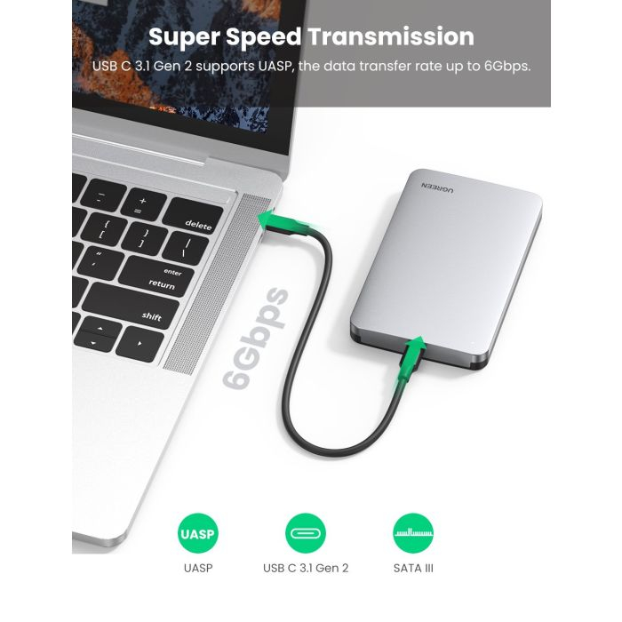 Ohišje trdega diska vsebuje najnovejša vrata USB-C 3.1 Gen 2, ki podpirajo hitrost prenosa podatkov 10 Gbps (7 + 15) Pin SATA III podpira največ 6Gbps prenos podatkov. Okrepljeno s pospešenimi protokoli za prenos - UASP (USB Attached SCSI Protocol) in TRIM omogoča, da ohišje trdega diska v celoti izkoristiti prednosti pogonov SSD.