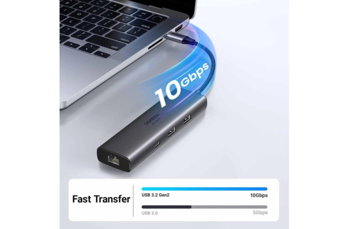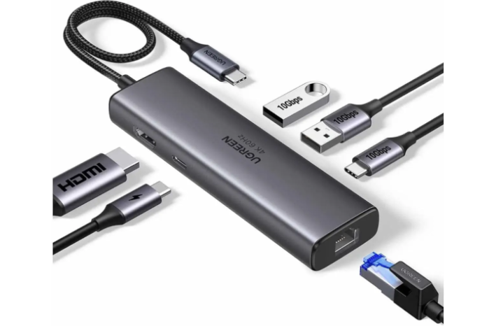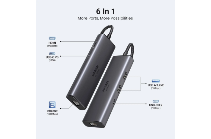 UGREEN 45000 je elegantna in zmogljiva 6-v-1 USB-C razširitvena postaja, ki vključuje HDMI 4K@60 Hz izhod, 2 × USB-A 3.2, 1 × USB-C 3.2, RJ-45 gigabitni Ethernet ter zunanji napajalni vhod PD do 100 W — idealna za prenosnike in delovne postaje.