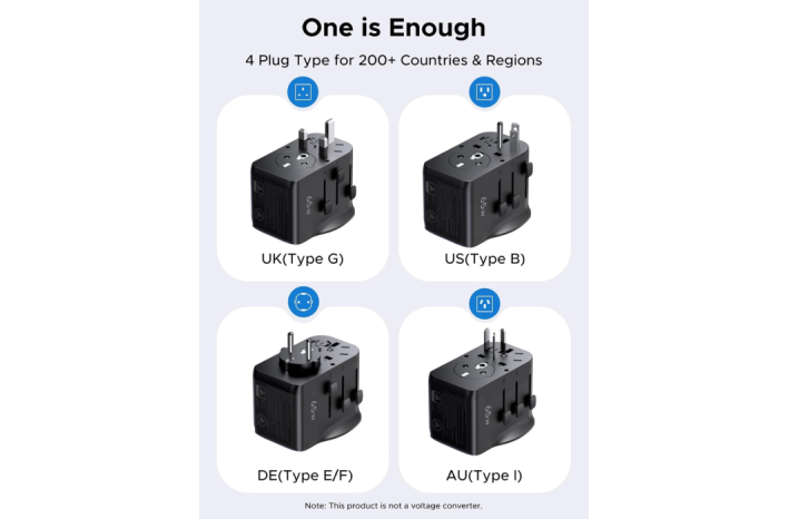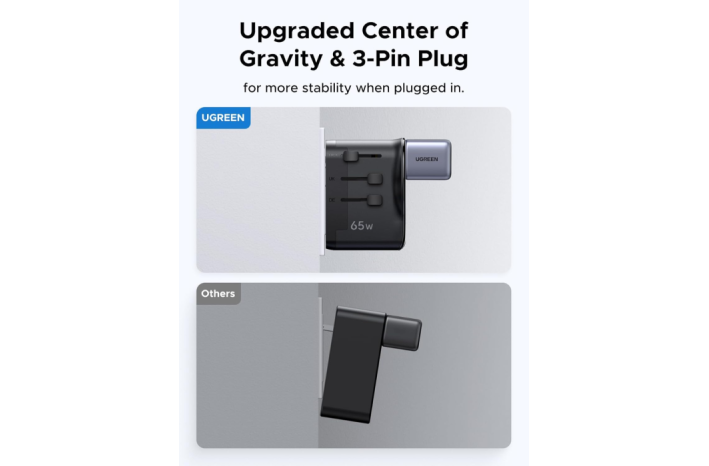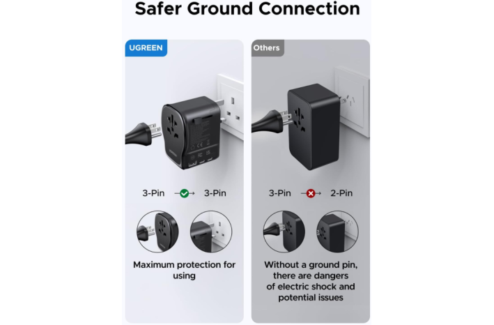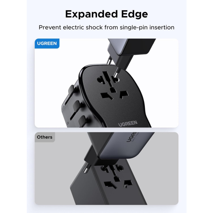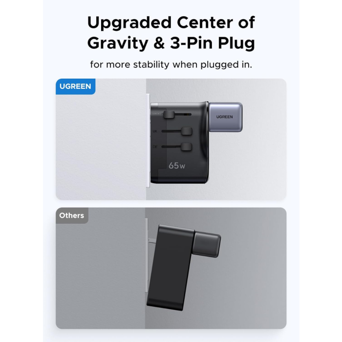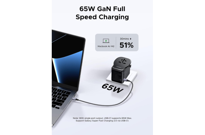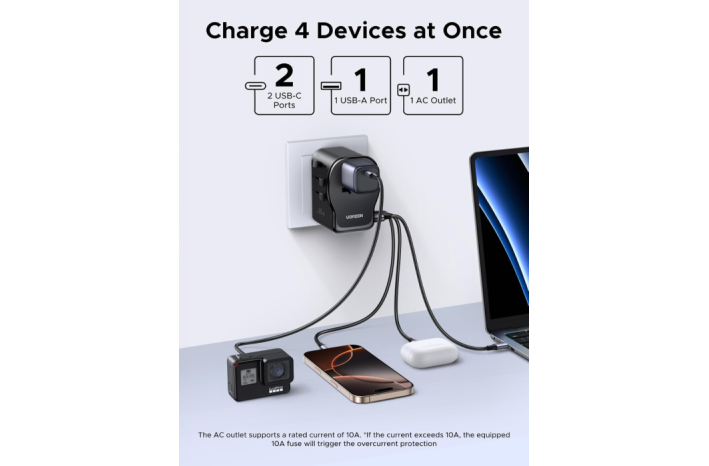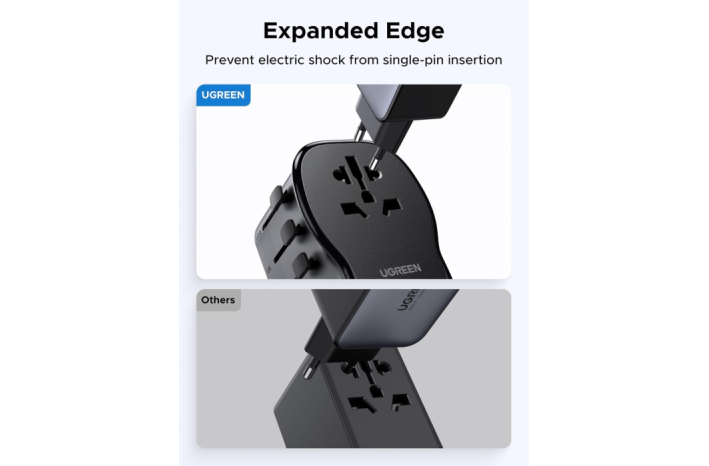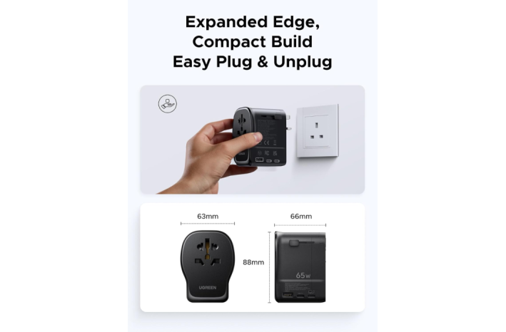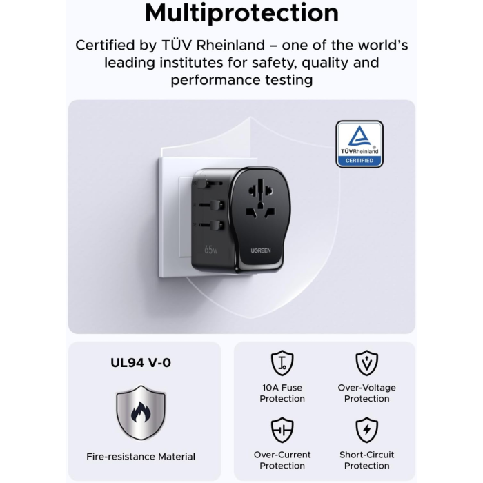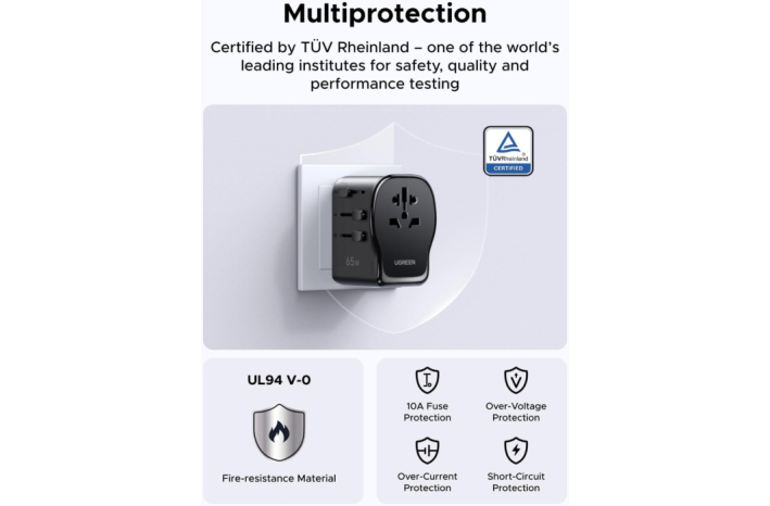 UGREEN 55001 (S550) je vsestranski univerzalni potovalni adapter z vgrajenim 65 W GaN polnilnikom, ki združuje kompaktno zasnovo, visoko moč in varnost. Opremljen je z dvema USB-C priključkoma, enim USB-A in univerzalno AC vtičnico, kar omogoča hkratno polnjenje več naprav kjerkoli na svetu.