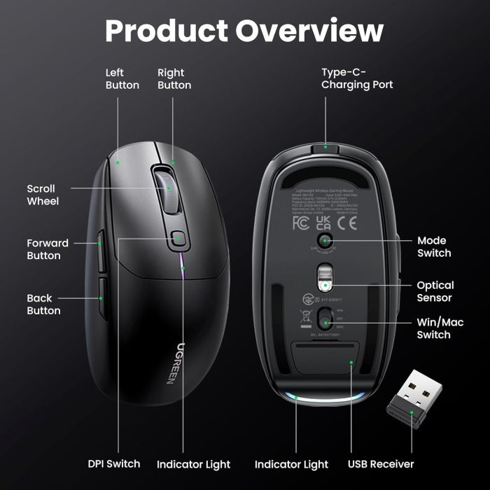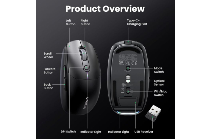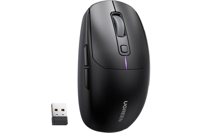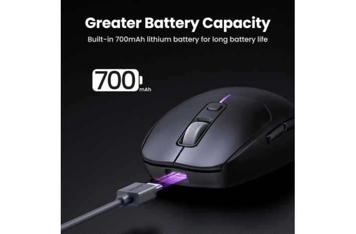 Miška UGREEN ima vgrajeno 700mAh baterijo in se lahko polni preko univerzalnega USB-C priključka.