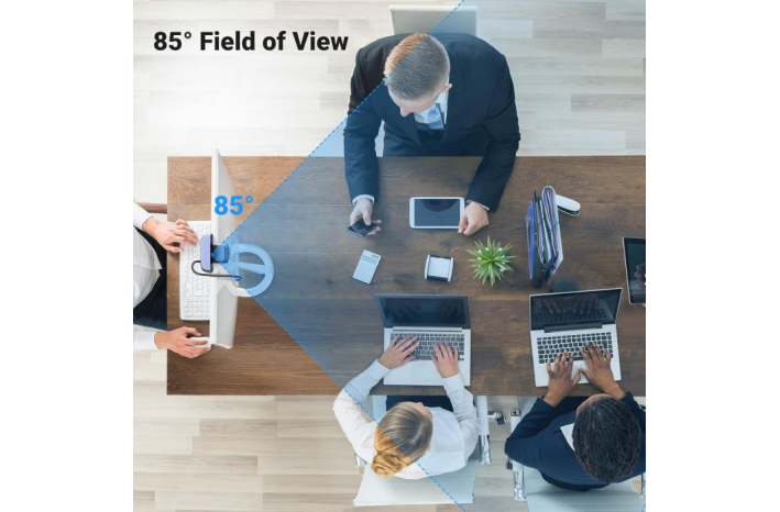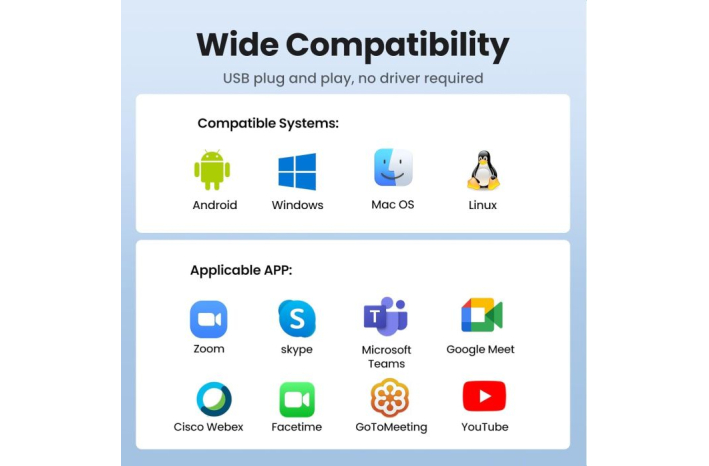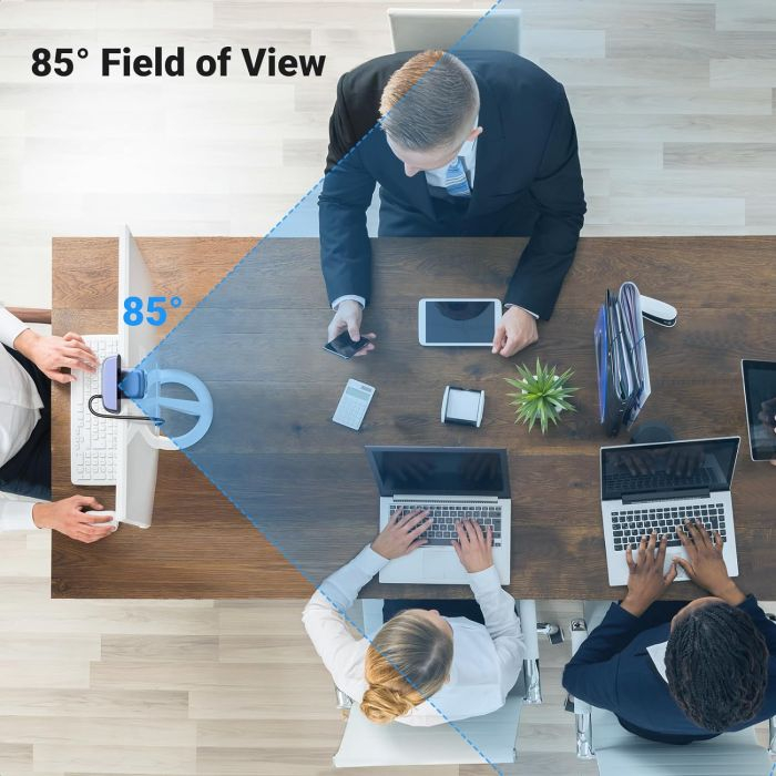 Z namestitvijo brez gonilnika in funkcijo plug-and-play lahko spletno kamero preprosto postavite na kateri koli monitor, prenosni računalnik, TV ali stojalo, zaradi česar je priročna možnost za vsakogar. Ne samo to, ima tudi vgrajeno kardansko kroglo, ki podpira vsestransko vrtenje za 360°, in 85° širokokotno lečo za sprejem več udeležencev.