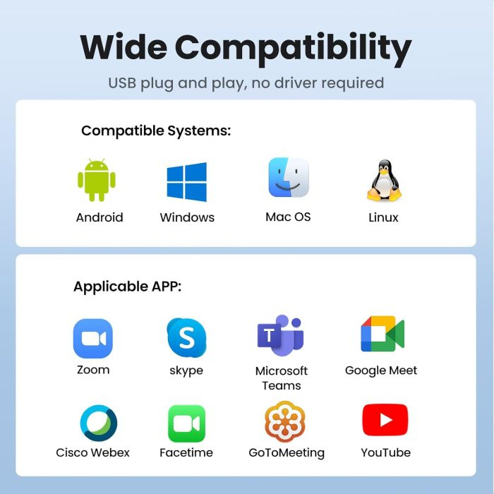 Spletna kamera UGREEN za osebni računalnik je opremljena z vgrajenima dvojnima mikrofonoma, ki lahko zajameta zvok z razdalje do 3 m. Računalniška kamera je opremljena z 2D digitalnim zmanjševanjem hrupa, ki filtrira hrup iz okolja, da zagotovi čist zvok med video klici ali snemanji, zaradi česar je vsak klic bolj naraven in jasen.