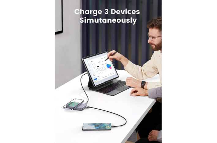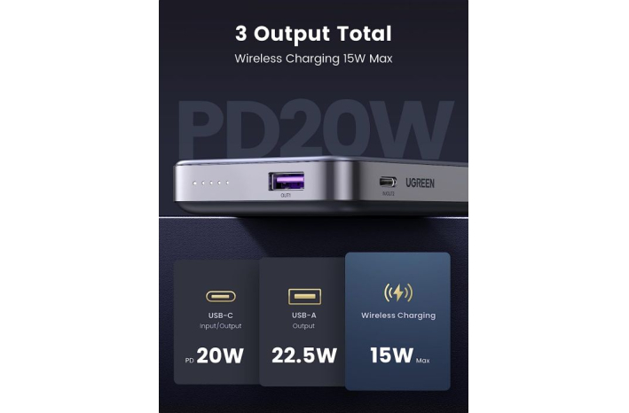 brezžična baterija lahko polni 3 naprave hkrati, podpira do 15 W brezžičnega polnjenja, največ 22,5 W izhodne moči USB-A PD in največ 20 W izhodne moči USB-C