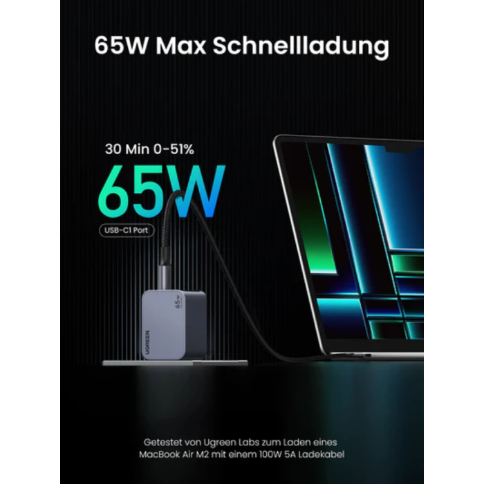 Z vrati USB-C1 lahko zagotovite učinkovito in izjemno hitro moč polnjenja največ 65 W, tako da lahko ta napajalnik s 65 W napolni vaš MacBook Air M2 od 0 % do 51 % v samo 30 minutah. Naredite vse hitro, mobilno in prilagodljivo.
