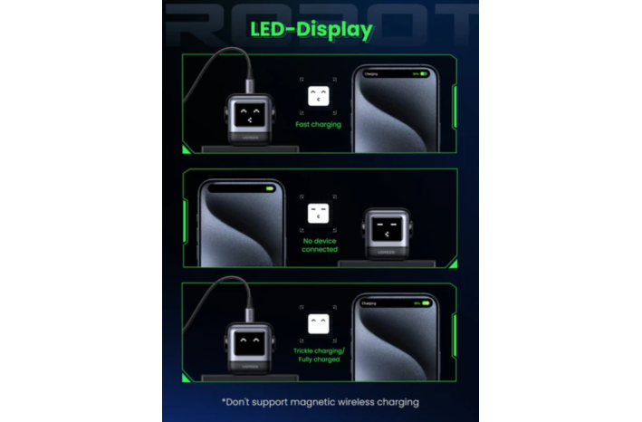 obraz robota je LED zaslon, ki prikazuje različne izraze za stanja polnjenja.