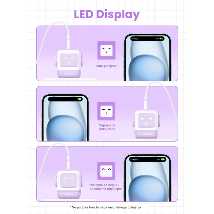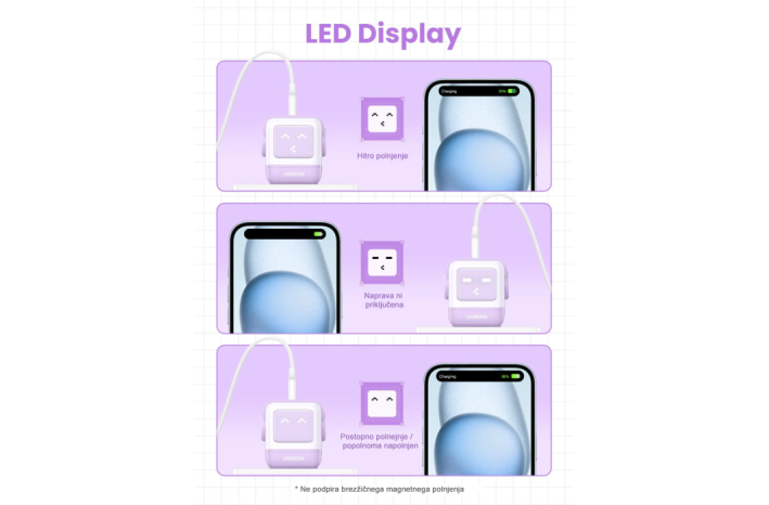 LED zaslon deluje le takrat, ko je polnilec priključen v električno omrežje.