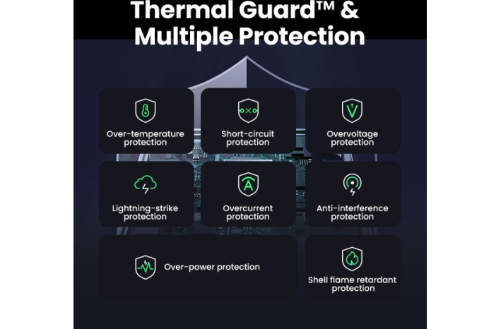 UGREEN zagotavlja maksimalno varnost uporabe, zato je polnilec Nexode Air opremljen s številnimi varovali. Zanesljivo ščitijo pred morebitnimi nevarnostmi, vključno s pregrevanjem, kratkimi stiki, preobremenitvijo, prevelikim tokom in čezmerno močjo. Poleg tega inteligentni sistem za upravljanje energije samodejno prilagodi moč polnjenja povezani napravi, da zagotovi še večjo zaščito.