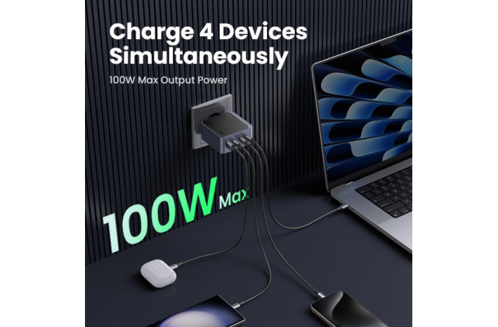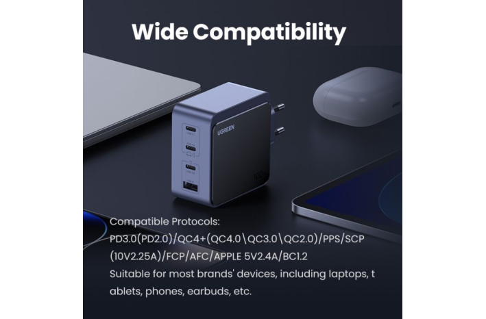 Pozabite na dolgo čakanje, da je vaša naprava pripravljena za uporabo! Polnilnik ponuja največjo moč do 100 W in podpira številne protokole hitrega polnjenja, vključno s QC, PD, AFC, PPS in Apple 5V/2.4A. Opremljen je tudi s 4 vhodi - 3x USB-C in USB-A, zahvaljujoč katerima lahko polnite do 4 naprave hkrati.