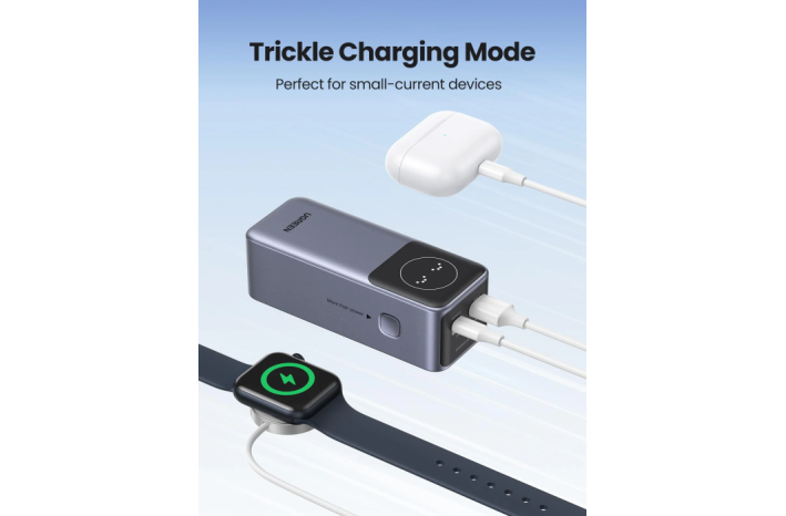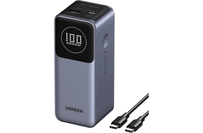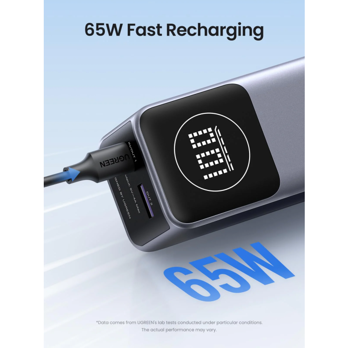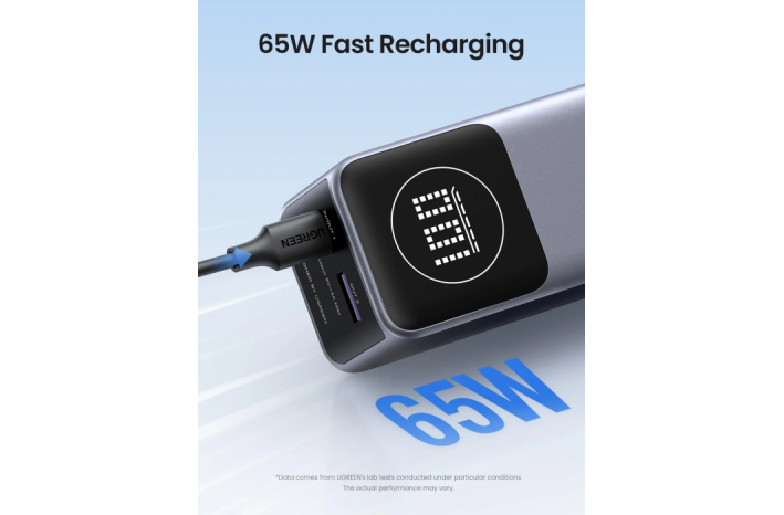vrata USB-C omogočajo dvosmerno hitro polnjenje. Powerbank popolnoma napolnite v samo 1,5 ure s 65 W vhodno močjo, kar zagotavlja, da je vedno pripravljen za uporabo.