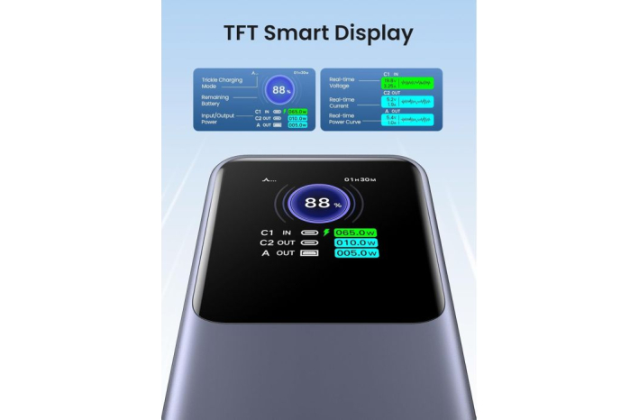 20000 mAh power bank je opremljen z zaslonom TFT, ki lahko prikazuje informacije v realnem času, kot so napolnjenost baterije, preostali čas polnjenja, izhodna/vhodna moč, napetost, tok itd., vsebina zaslona je bolj občutljiva, barve so bogatejši