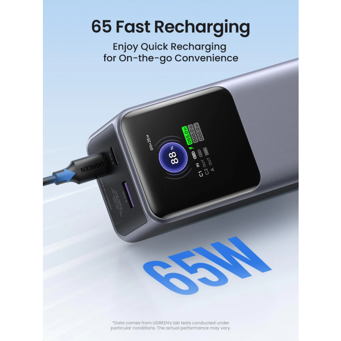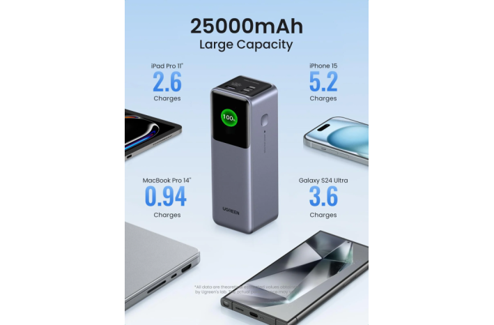 Napajalna banka UGREEN 25000 mAh zagotavlja neprekinjeno in zanesljivo napajanje, tako da popolnoma napolni MacBook Pro 16" do 1,3-krat, iPhone 15 do 5,2-krat in Galaxy S23 Ultra do 3,6-krat. Zmogljivost 90 Wh, ki jo odobrena iz strani letalskih družb, je idealna za ročno prtljago, da bo vaše potovanje po svetu polno energije.