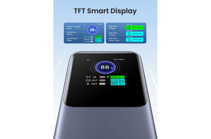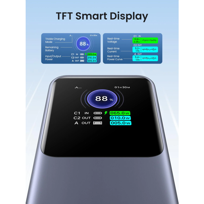 Zagotovite si pametnejšo izkušnjo polnjenja prek vrhunskega digitalnega zaslona, ki prikazuje preostalo baterijo, napetost v realnem času, tok v realnem času, vhodno moč in izhodno moč. Hitro in intuitivno lahko razumete stanje napolnjenosti različnih naprav.