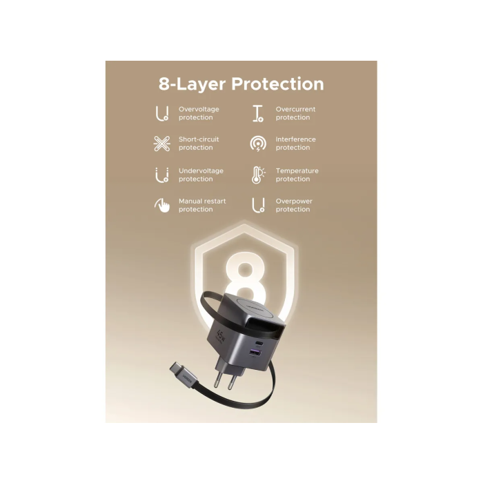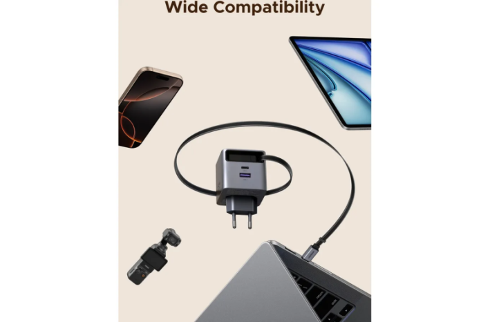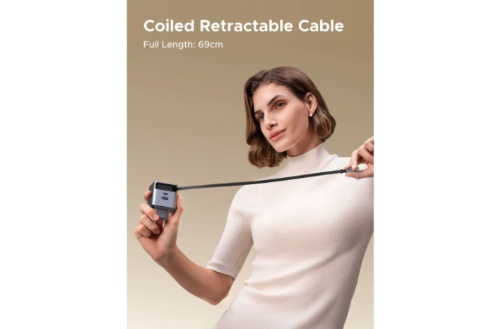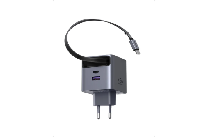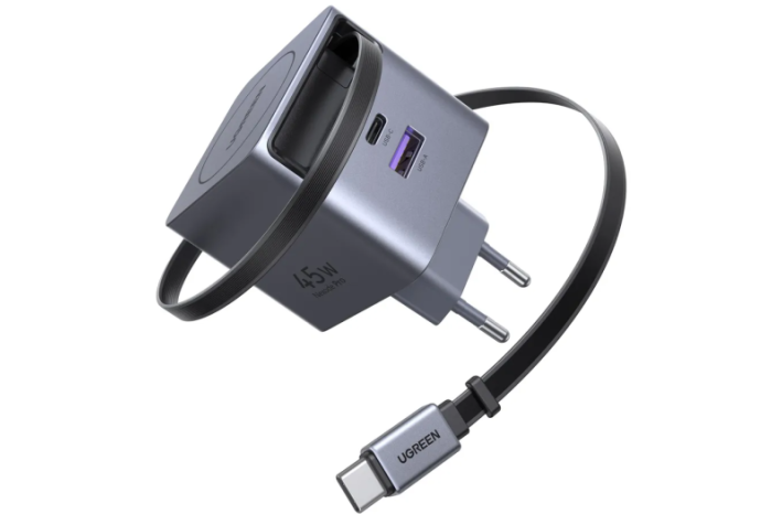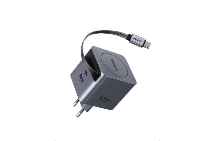 45W GaN hitri polnilec z izvlečnim kablom je polnilec podjetja UGREEN, ki ponuja učinkovito in prilagodljivo polnjenje za več naprav. Z vgrajenim izvlečnim kablom dolžine 0,7 metra lahko uporabnik nastavi dolžino v do osem različnih stopenj. Polnilec je prestal več kot 25.000 testov izvleka in več kot 10.000 testov upogibanja, kar zagotavlja vzdržljivost in enostavno uporabo.