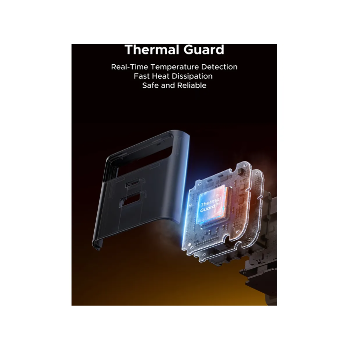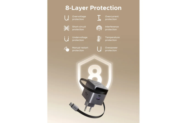 Polnilec ima tri različne priključke, ki omogočajo sočasno polnjenje do treh naprav, kar je priročno, ko je treba napajati več naprav hkrati. Tehnologija GaNInfinity™ zagotavlja 95 % učinkovitost in kompakten dizajn, ki je enostaven za prenašanje na poti. Polnilec vključuje osem plasti zaščite pred previsokim tokom, prenapetostjo, pregrevanjem in drugimi tveganji, medtem ko Thermal Guard™ spremlja temperaturo 200-krat na sekundo, da zagotovi stabilno in varno polnjenje.