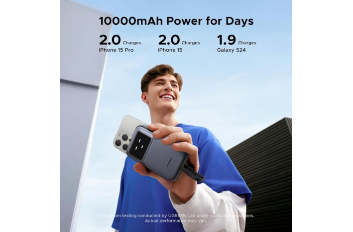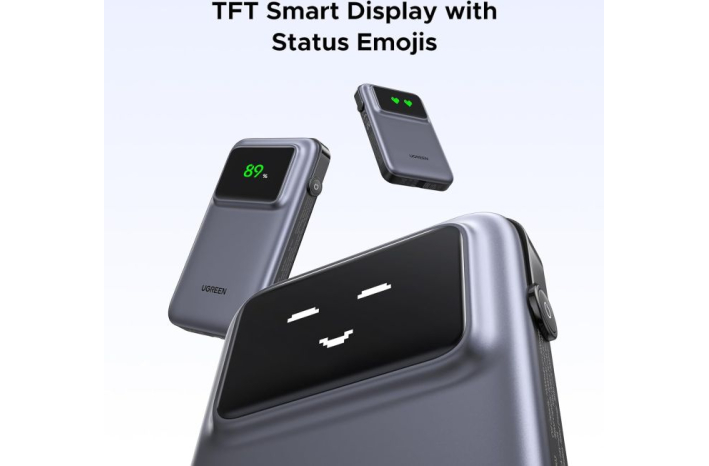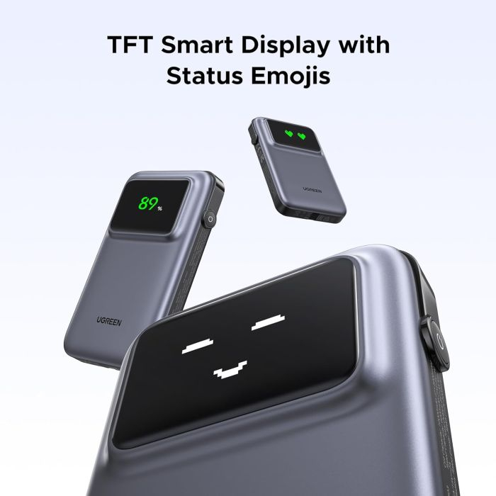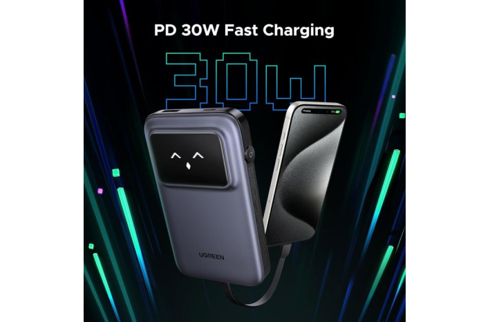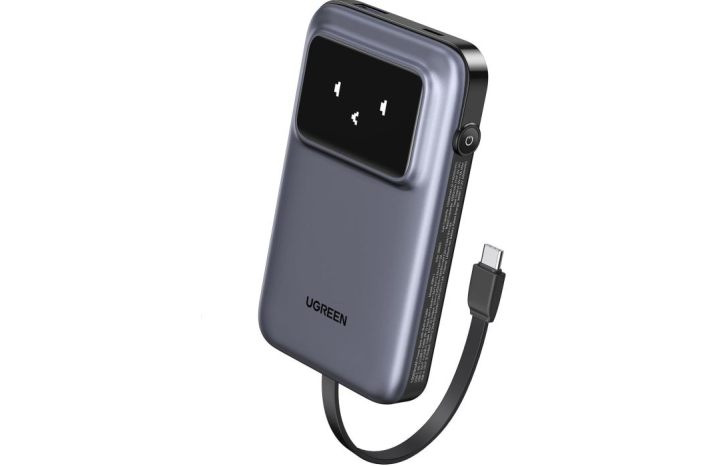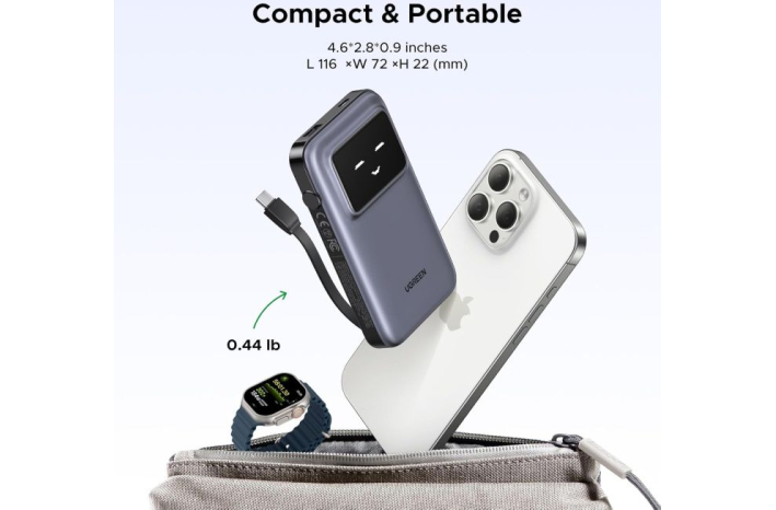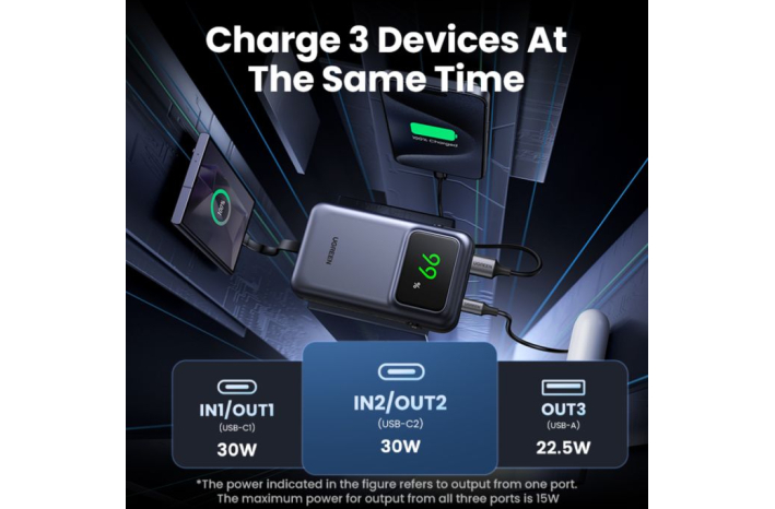 Prenosni polnilnik Ugreen ima vgrajen polnilni kabel usb c, zaradi česar je polnjenje bolj priročno, ima tudi vmesnik USB-A in USB-C, ki lahko napaja 3 naprave hkrati, kar poveča produktivnost