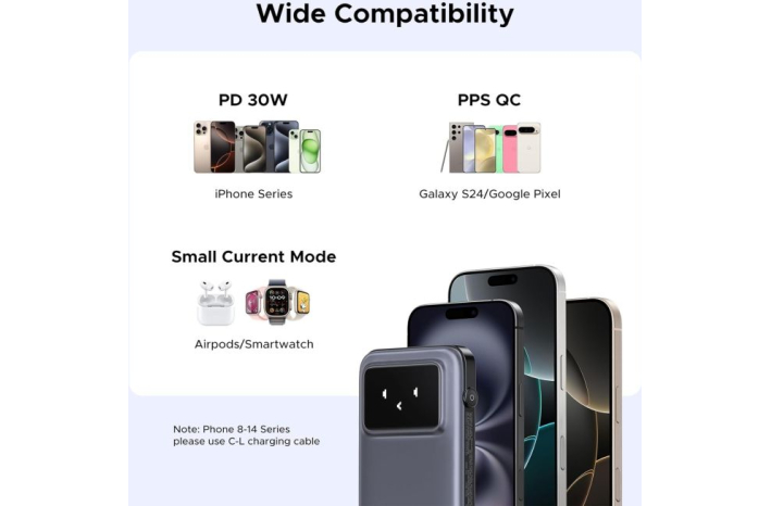 USB c power bank je združljiv s skoraj vsemi priljubljenimi mobilnimi telefoni ali tabličnimi računalniki, kot so serije iPhone 16/15/14/13/12/11, serija Galaxy S24/S23/A52/A32/Z Fold serija Z Flip serija, Pixel 7Pro 6 6a series in drugi telefoni in tablični računalniki Android itd