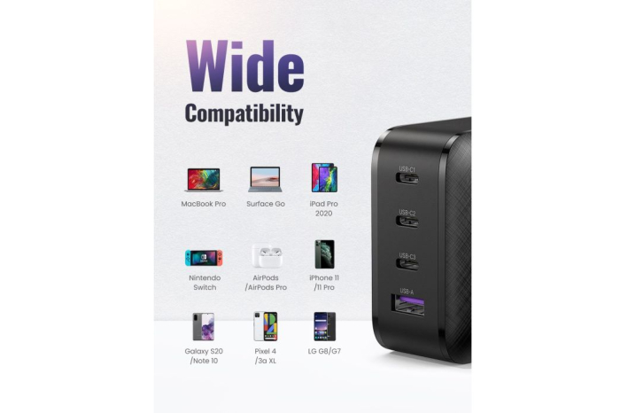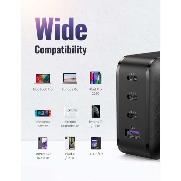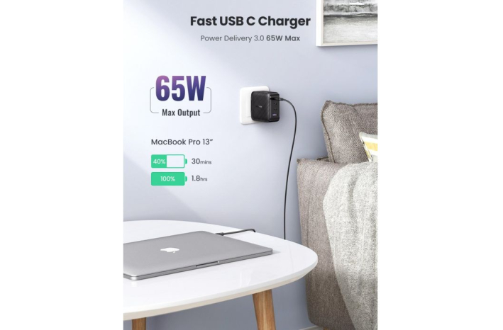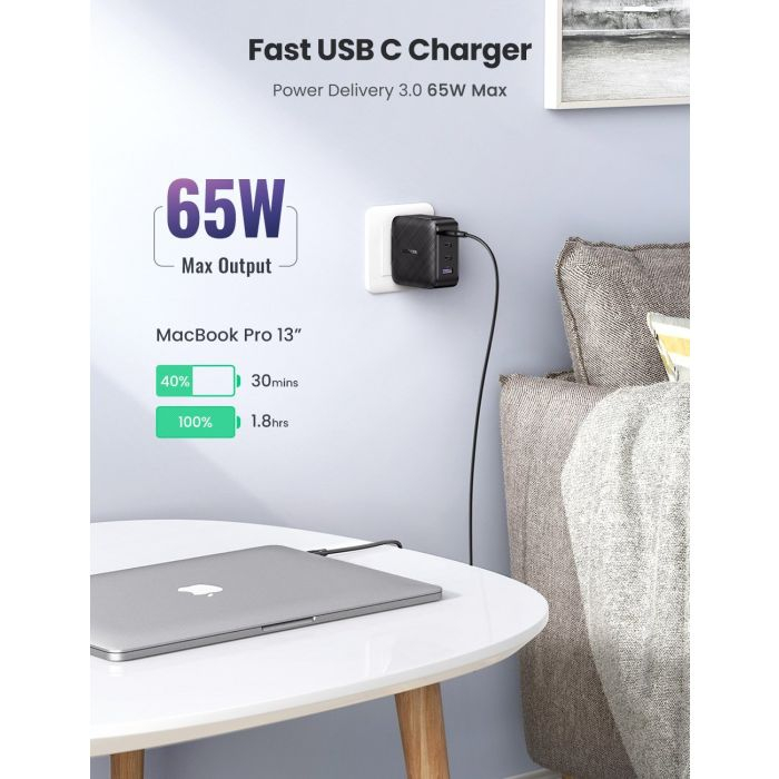 Polnilnik UGREEN 65W GaN PD za iPhone X v 30 minutah napolni v 30 minutah hkrati s hitrim polnjenjem za iPhone 12, iPhone 12 Pro, iPhone 12 Mini, iPad Air 2020, iPad Pro 2020, Nintendo Switch in AirPods. Inteligentno upravljanje napajanja zagotavlja optimalno moč polnjenja za hitro polnjenje naprav.