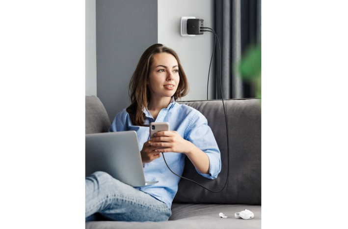 Hitri polnilnik GaN PD 65 W, opremljen s 4 vrati, ima ergonomsko zasnovo in za vas prihrani 50% prostora. Le 165 g, polovica teže zvitka toaletnega papirja