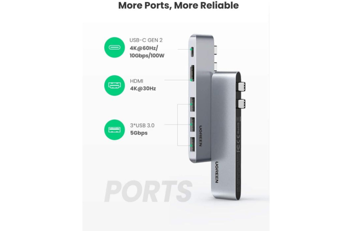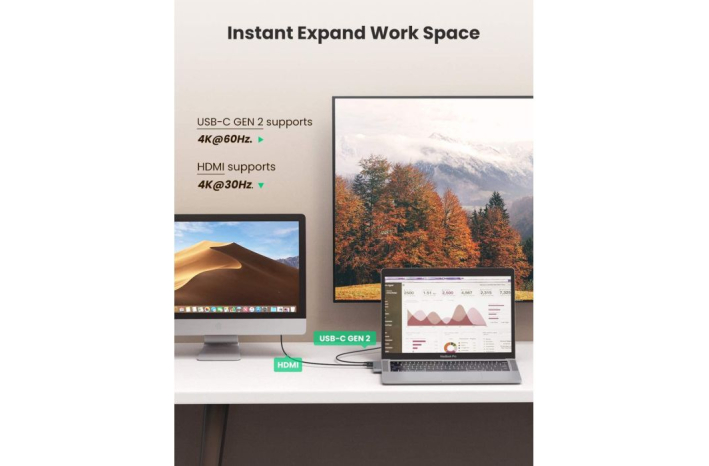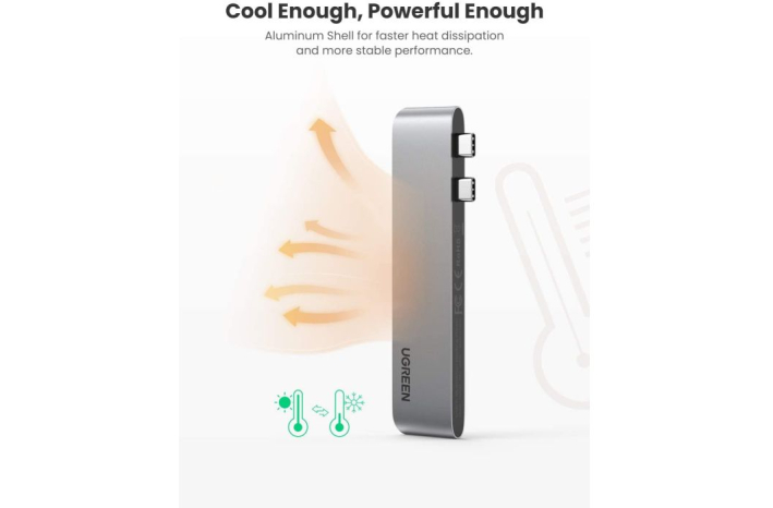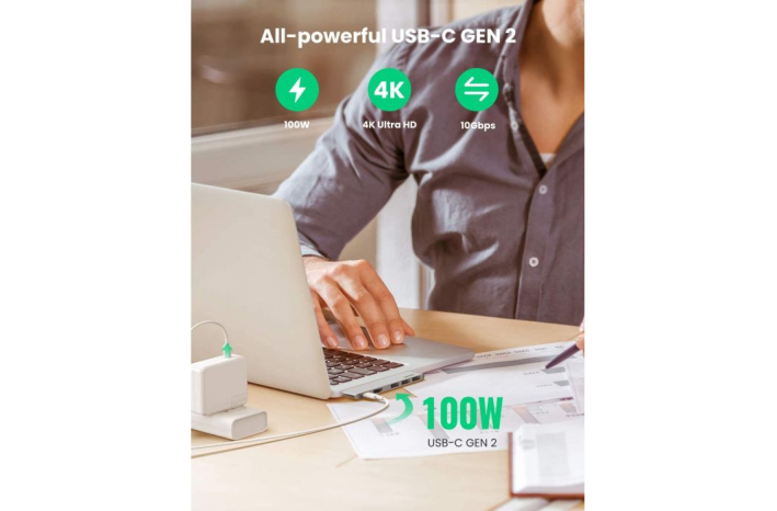 Ugreen Hub podpira PD Power USB z močjo 1000 W PD 2.0, ki omogoča hitro polnjenje prenosnega računalnika pri povezovanju z zidnim adapterjem PD. Hitro polnjenje je na voljo samo za prenosne računalnike. Za telefone podpira le običajno polnjenje.