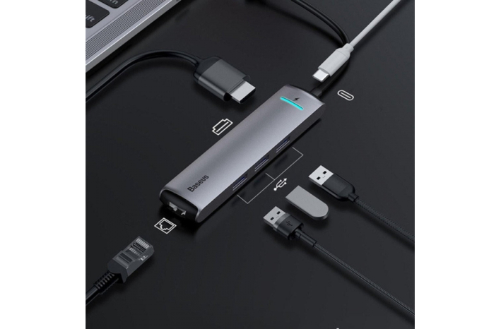 USB Type-C priklopna postaja BASEUS 6v1 (docking station) je vrhunska rešitev za povezovanje več naprav preko enega samega priključka. Zagotavlja hitro polnjenje, visoko kakovostno sliko in stabilno internetno povezavo. Idealen dodatek za vašo pisarno ali dom.