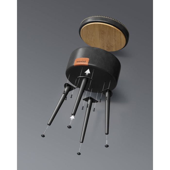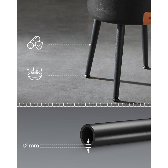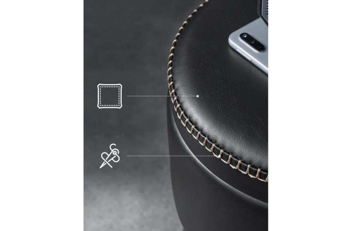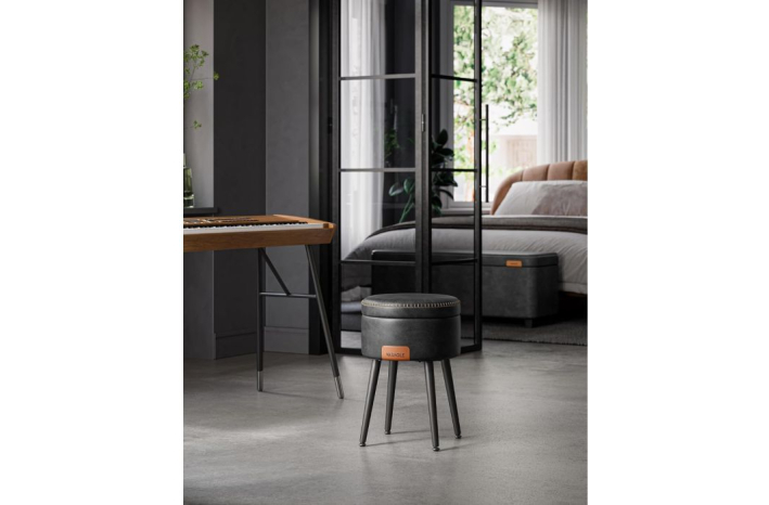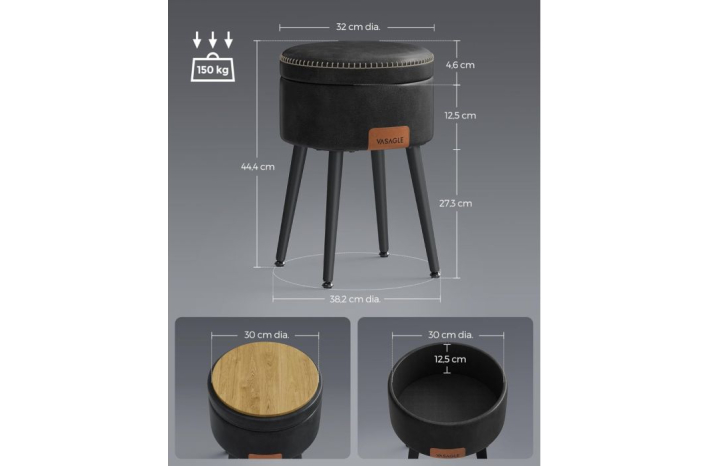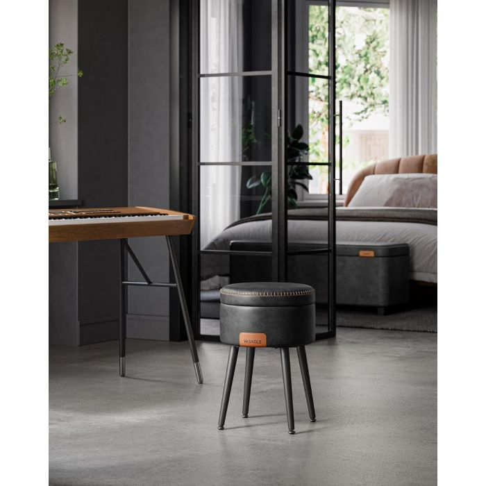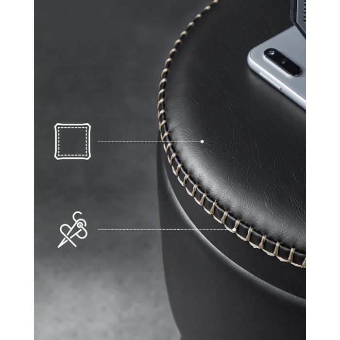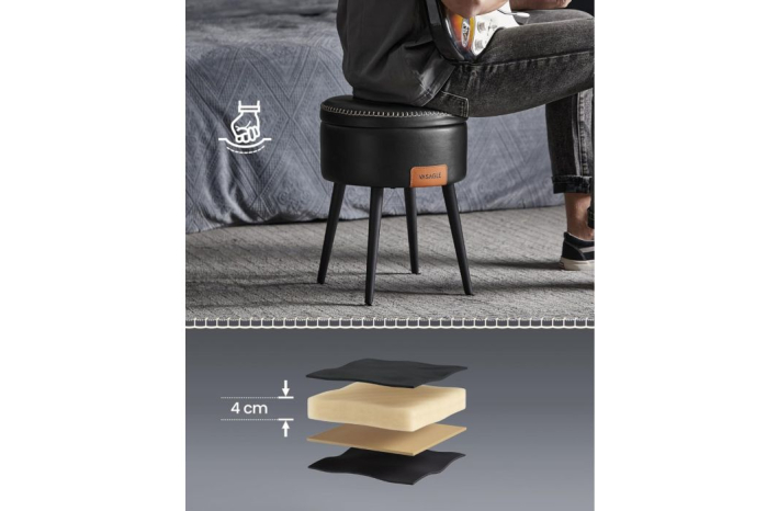Eleganten in vsestranski, VASAGLE EKHO LOM005B01 združuje udobje s funkcionalnostjo. Tabure z oblazinjenim pokrovom iz črnega umetnega usnja z dekorativnim šivanjem zagotavlja udobno sedenje ali počitek stopal. Notranjost s prostornino približno 9,4 l omogoča shranjevanje drobnih predmetov, medtem ko štiri kovinske noge zagotavljajo stabilnost. Nizek okrogel dizajn se odlično poda k fotelju, pred toaletno mizico ali v dnevni prostor. Lahko se uporablja kot tabure, podnožnik ali stranski mizica.
