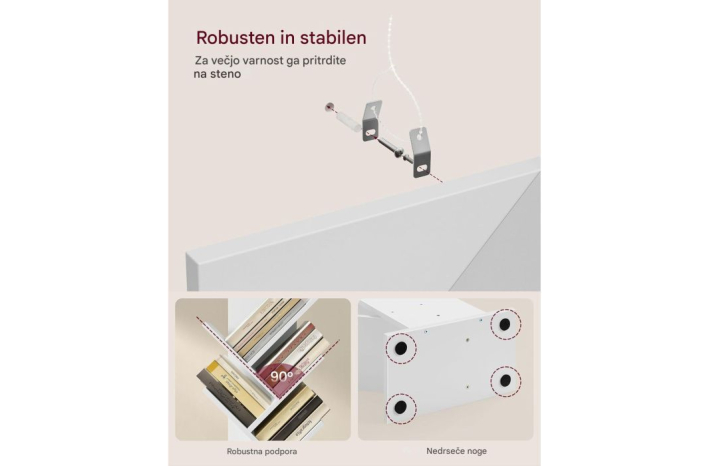 Stabilna in varna: Izdelana iz kakovostne iverne plošče in opremljena z napravo proti prevračanju za dodatno varnost – vsaka polica prenese do 10 kg.