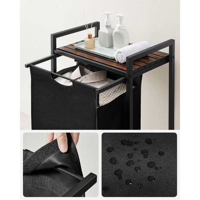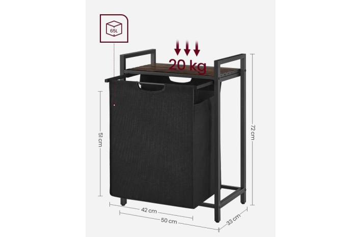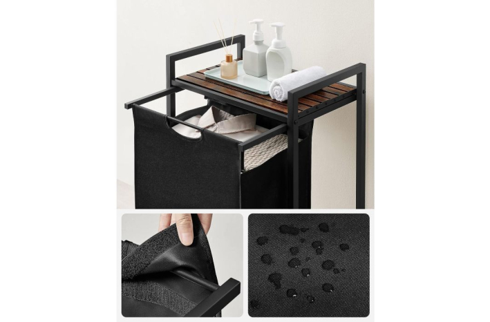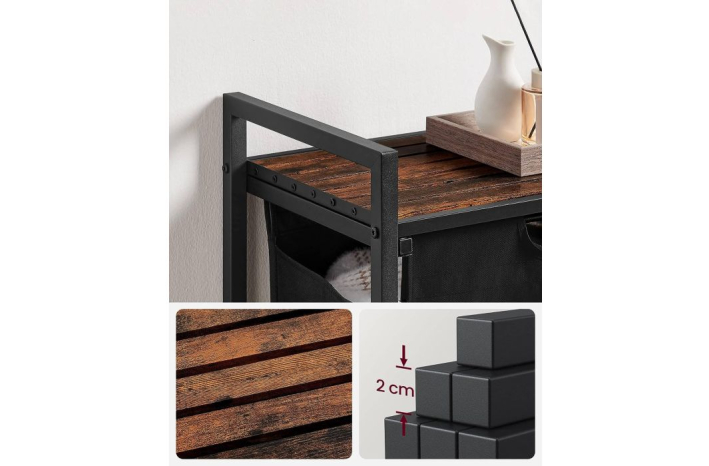 Trdna in stabilna: izdelana iz okvirja iz 2 cm jeklene cevi in plošče iz MDF, podpira do 20 kg na zgornji polici. Poleg tega je košara izdelana iz vodoodbojne tkanine Oxford, štiri nastavljive noge pa zagotavljajo stabilnost