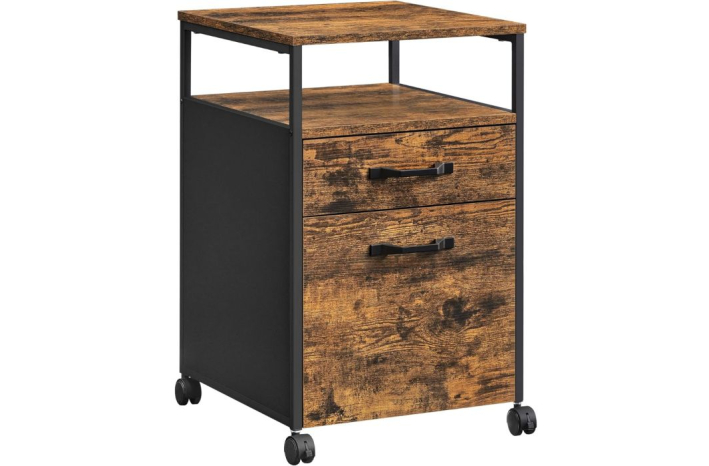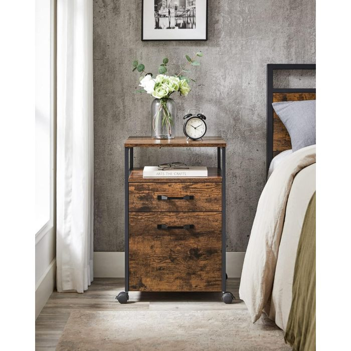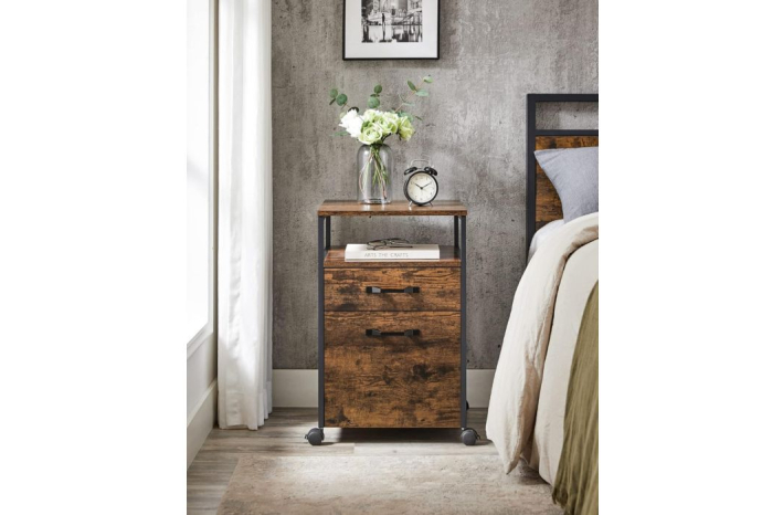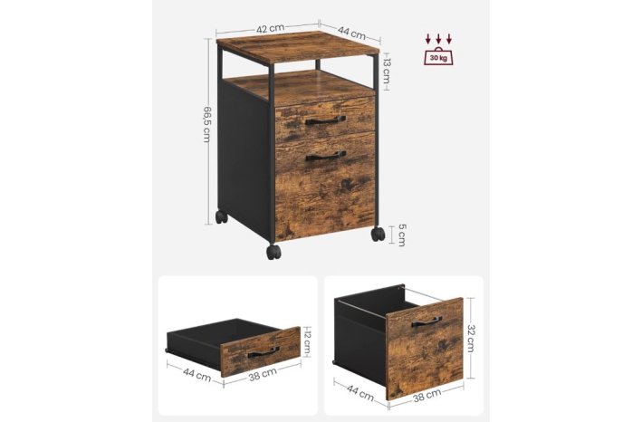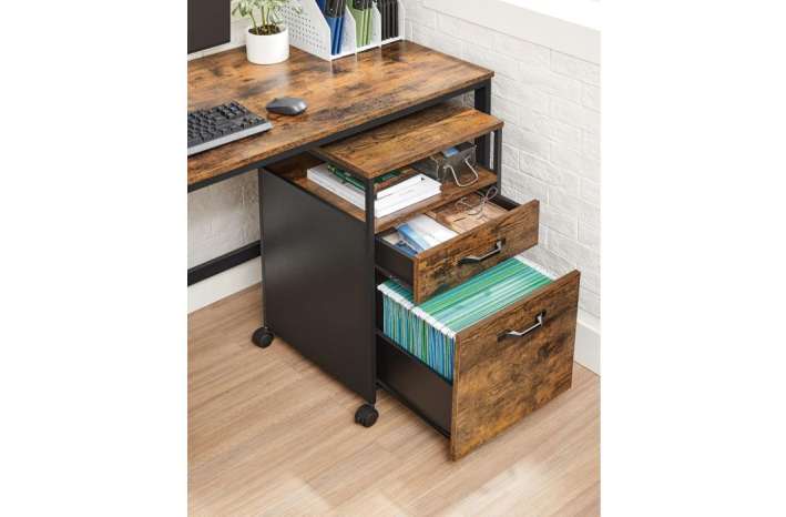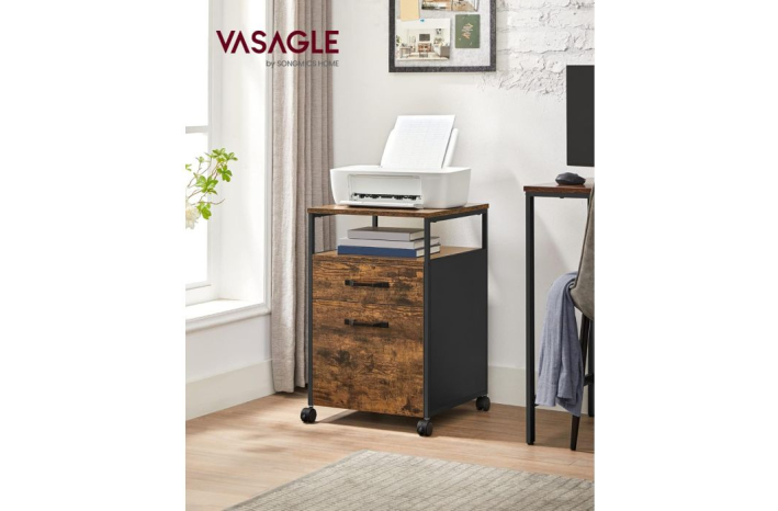 Uredite svojo delovno mizo z več stila! VASAGLE premični predalnik v kombinaciji rustikalnega lesa in črne kovine prinaša industrijski pridih, ki se lepo poda tako v sodobno pisarno kot domač kotiček. S tremi prostornimi predali lahko shranite pisarniške pripomočke, dokumente ali osebne stvari, medtem ko štiri kolesca (dve z zavoro) omogočajo enostavno premikanje in stabilnost. Robustna jeklena konstrukcija in kakovostna iverna plošča zagotavljata trpežnost, kompaktna širina pa omogoča, da predalnik enostavno zdrsne pod pisalno mizo.