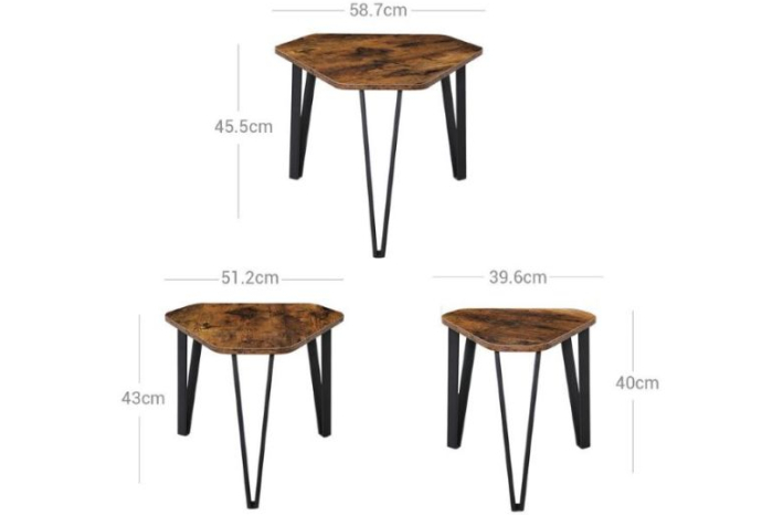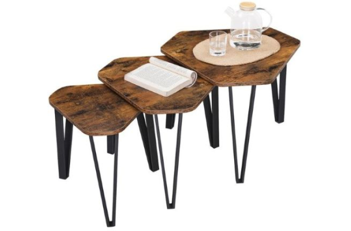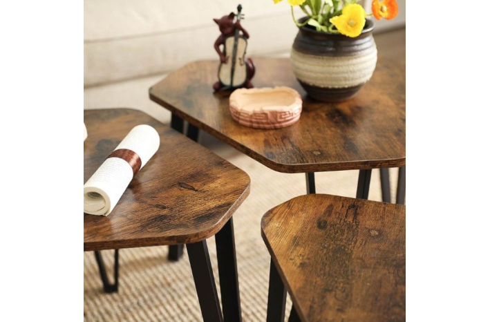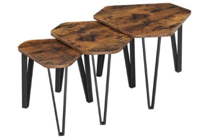 RUSTIKALEN ČAR: Rustikalni rjavi leseni vrhovi izžarevajo pridih klasičnega sloga iz starih časov, togi jekleni okvirji pa dajejo industrijski pridih. Zdaj se združujejo v tem kompletu miz, ki v vaš dom prinašajo pozitivne vibracije.