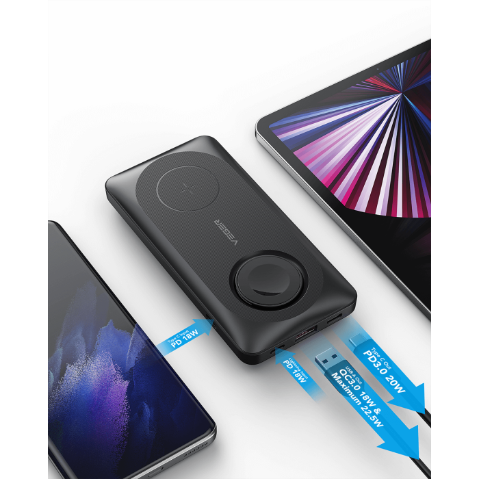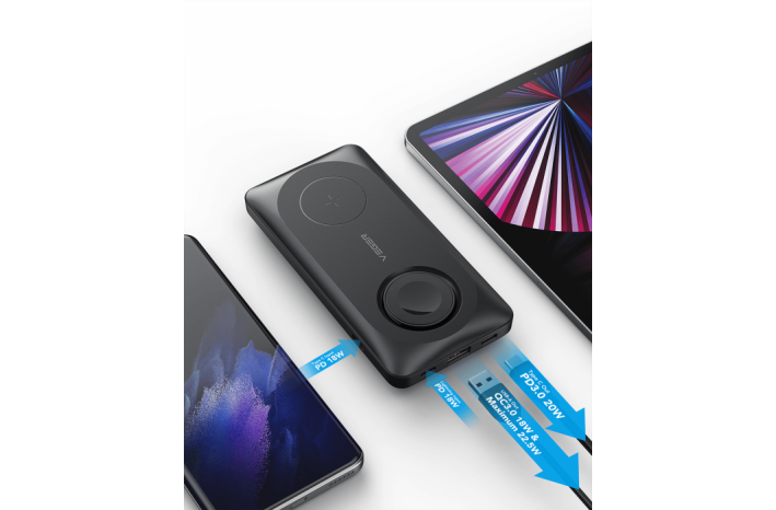 Z 20 W PD Lightning In in Type-C In/Out vrati, ki podpirajo PPS, PD/QC3.0, USB QC 3.0 izhodna vrata, lahko vašim telefonom ali tablici v kratkem času omogočijo močno polnjenje.