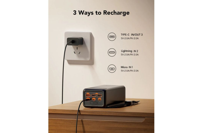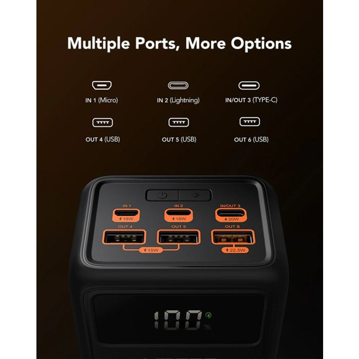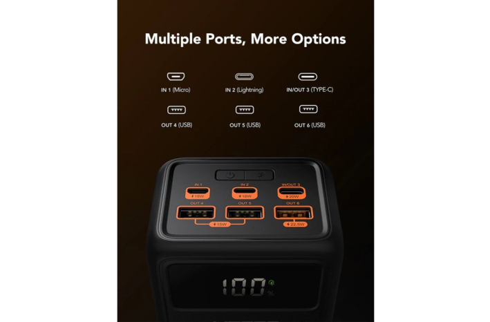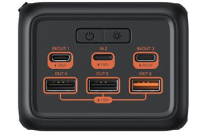 4 izhodi lahko polnijo 4 naprave hkrati, TYPE-C IN/OUT 3 podpira QC18W in PD20W, USBA OUT4/5 ima PD18W, USBA OUT6 zagotavlja največ 22,5 W.
