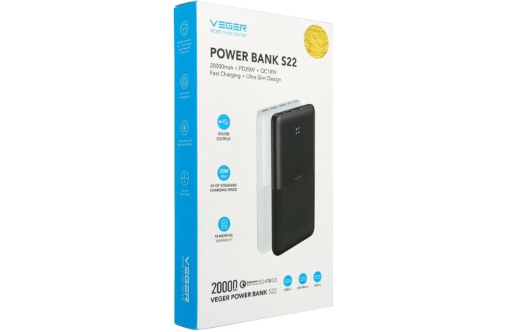 6 priključkov, vključno z micro USB, USB‑C in 3× USB‑A, podpira tehnologije Power Delivery (20 W), Quick Charge 3.0 (18 W), AFC, SCP in FCP, kar omogoča istočasno polnjenje do štirih naprav – npr. pametnega telefona, tablice, prenosne igralne konzole ali TWS slušalk. Prek priključka USB‑C lahko preprosto povežete tudi najnovejše naprave.