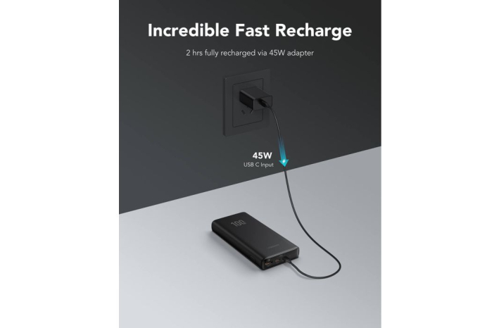 Izjemno hitro 45W PD polnjenje Združite priložen USB-C na USB-C kabel s 45W stenskim polnilcem (ni priložen), da napolnite power bank v 2 urah.
