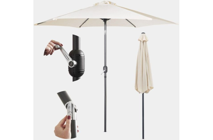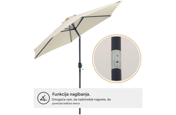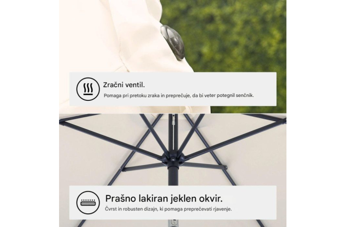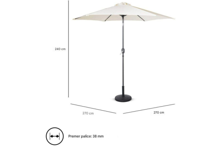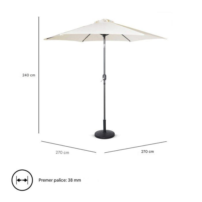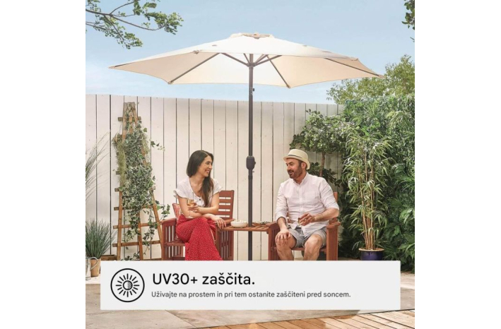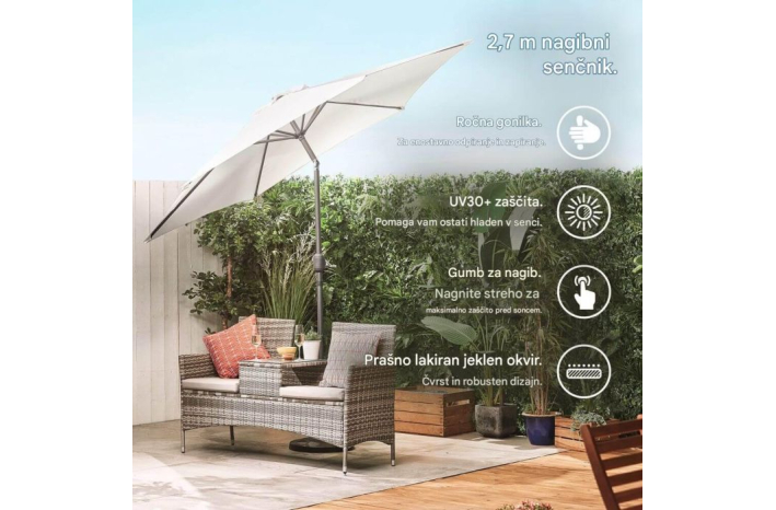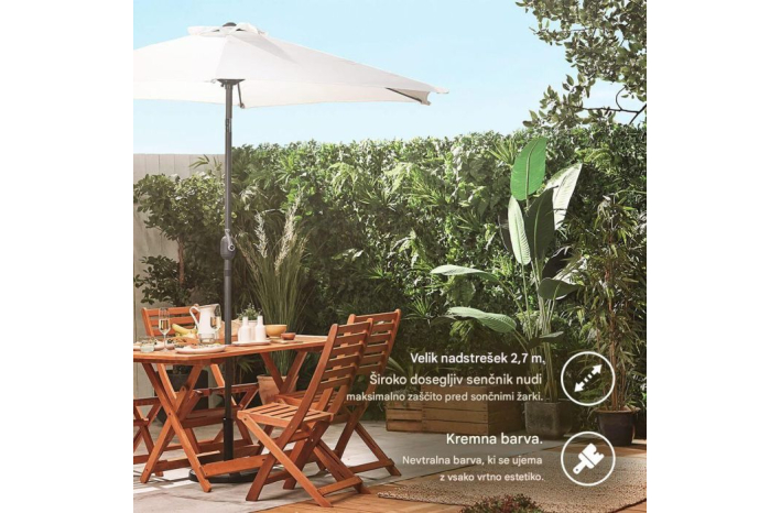 S premerom 2.7m, sončnik ponuja veliko senco in je primeren za namestitev nad mizo na terasi ali kje drugje.