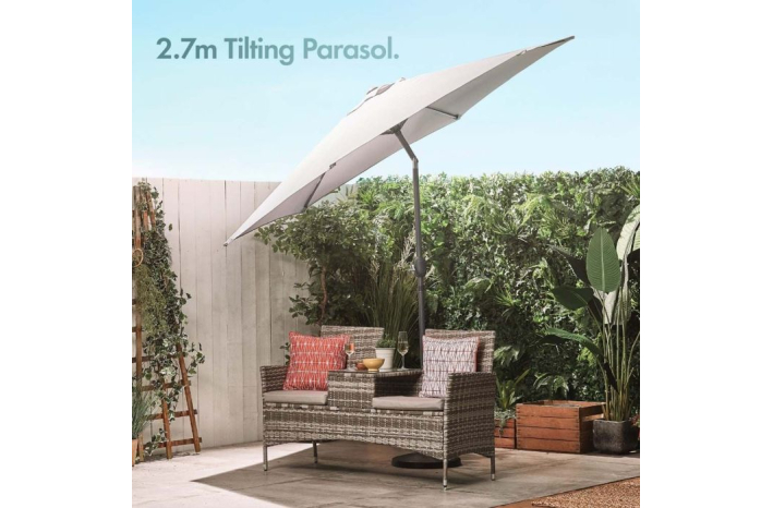 S premerom 2.7m, sončnik ponuja veliko senco in je primeren za namestitev nad mizo na terasi ali kje drugje.